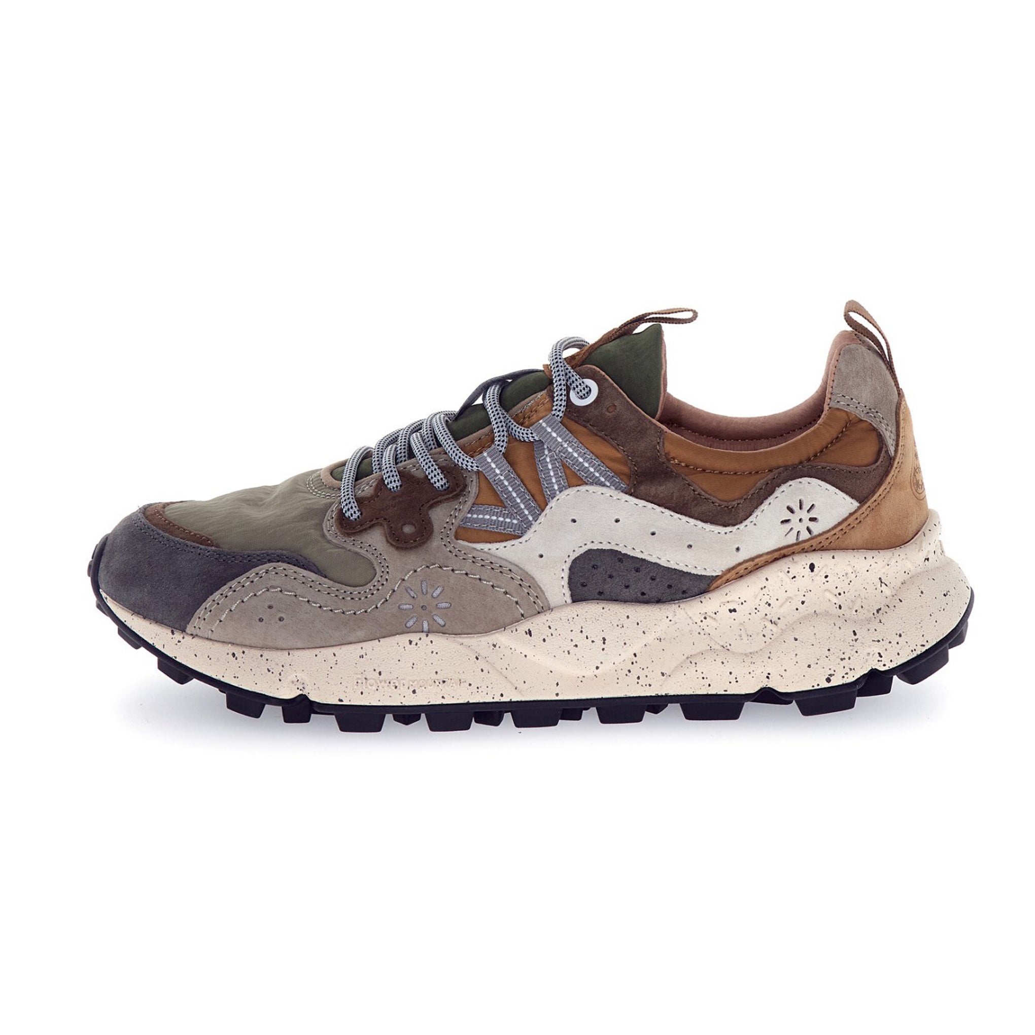 Sneaker in tessuto tecnico e suede, con occhielli rinforzati, lacci trekking, soletta interna in sughero anatomica e antibatterica. Suola in gomma ultraleggera con battistrada dentellato.