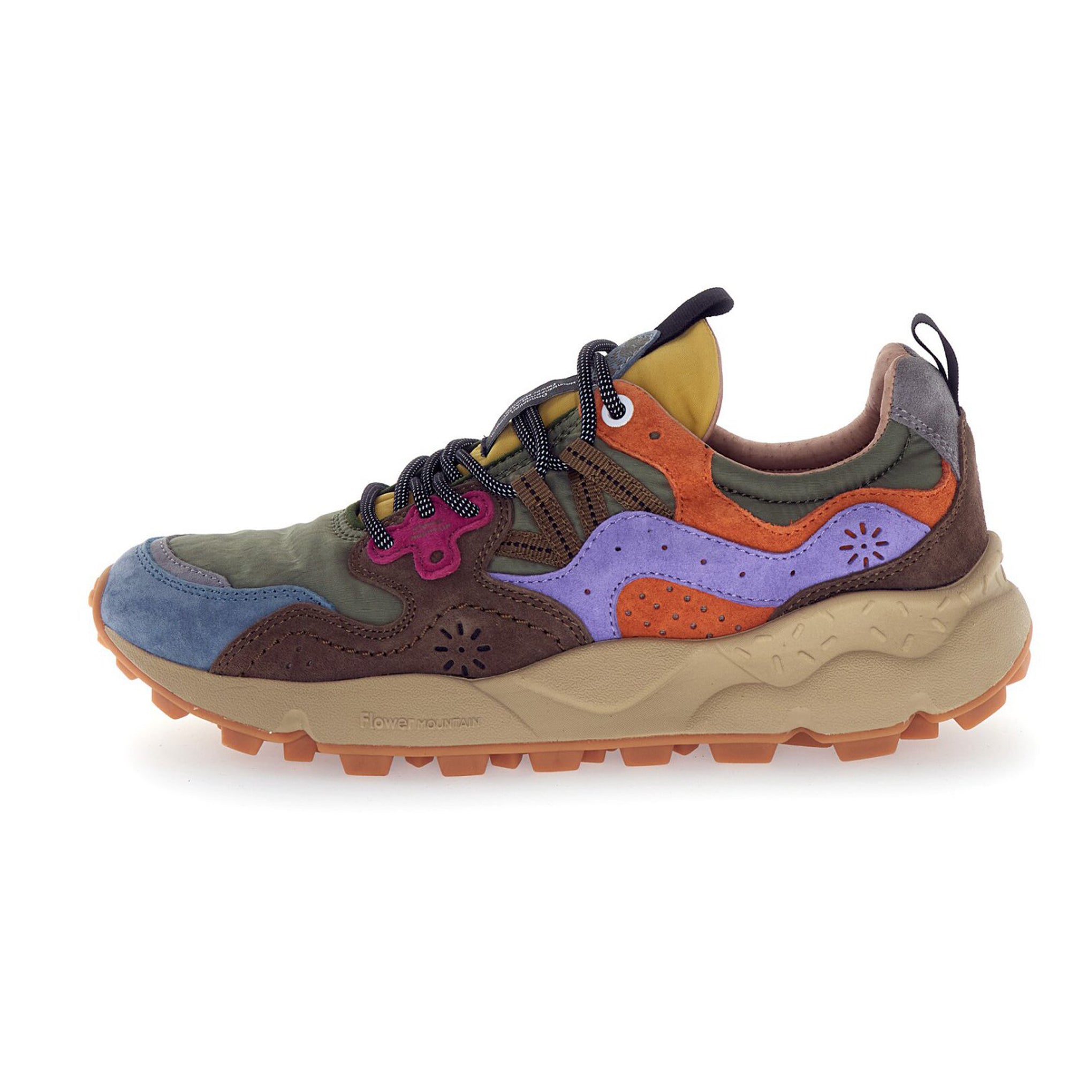 Sneaker in tessuto tecnico con tessuto tecnico e inserti in suede multicolour. Stringhe trekking e occhiello sagomato personalizzato. Fodera in pelle e tessuto e suola in sughero naturale antibatterico. Fondo in gomma ultra leggera con battistrada dentellato.